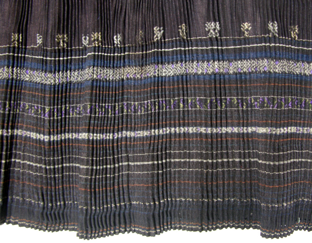 Though made and worn by several of China's Ethnic Minority groups, the pleated skirt is most common to the Miao Minority. Variations in length of the skirt, number and depth of the pleats and surface decoration distinguish the skirts of one group from another.